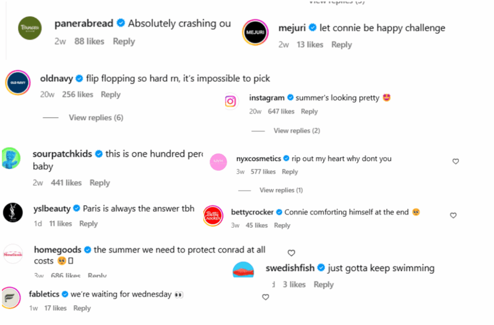 Another way brands have been engaging on social media is in the comments section. Any social media pro knows that engagement is key to growth, and it goes both ways. By leaving a comment, brands are taking a low-risk approach while inserting themselves into the conversation. Here are a few comments left on various posts from @The Summer I Turned Pretty from some major brands: